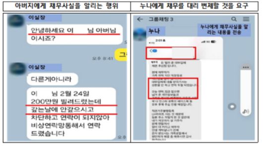 가족에게 채무사실을 알리거나 채무 대리 변제를 요구하는 사례. 금융감독원 제공 |