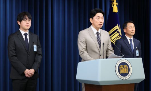 강훈식 대통령비서실장이 15일 서울 용산 대통령실에서 인선 발표를 하고 있다. 왼쪽부터 하정우 AI미래기획수석, 강 비서실장, 김현종 국가안보실 1차장. 연합뉴스 |