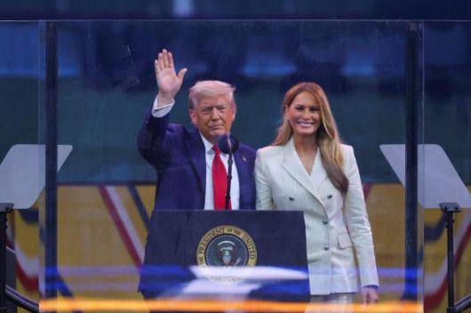 미 육군 창설 250주년 기념 군사 퍼레이드 직후, 자신의 79번째 생일을 맞은 도널드 트럼프 미국 대통령이 퍼스트레이디인 멜라니아 트럼프와 함께 손을 흔들고 있다. [사진=로이터연합뉴스] |
