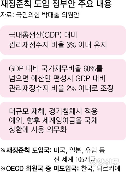 윤석열 정부 때 나온 법안은 관리재정수지 적자를 국내총생산(GDP)의 3% 이내로, 국가채무 비율은 60% 이내로 각각 묶는 내용을 담았다. 유럽연합(EU)의 재정준칙 기준과 비슷하다. 경제협력개발기구(OECD) 주요국 가운데 재정준칙을 도입하지 않은 곳은 한국과 튀르키예 정도다.