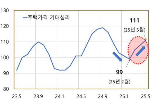 한은은 매달 자체적으로 추산하는 주택가격전망 소비자동향지수(CSI)를 바탕으로, 주택가격 기대심리의 특징과 파급 효과를 분석했다. 이 지수는 지난 2월 99로 저점을 찍은 뒤 지난 달 111까지 올랐다. 서울 지역의 아파트 가격과 금융권의 가계대출 증가세는 지속해 확대되는 양상이다.