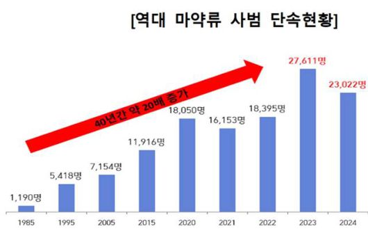 백서에 따르면 지난해 단속 마약사범은 2만3022명으로 2023년 2만7611명보다 16.6% 감소해 최근 몇 년간 지속적 증가 추세가 다소 수그러든 것으로 조사됐다. 다만 최초 집계된 1985년 1190명에 비하면 약 20배 수준이다.