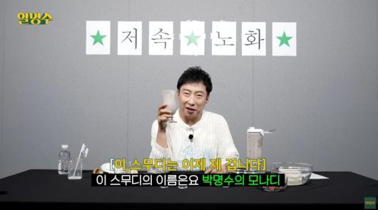 박명수가 저속노화를 위한 셀럽들의 스무디를 하나씩 만들고 본인만의 레시피도 뚝딱 만들어 냈다.