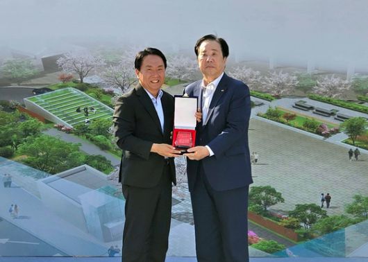 우오현 SM그룹 회장(오른쪽)이 지난 12일 서울 서대문구 독립문문화공원에서 공영주차장 신축으로 주민 편의를 제공한 것에 대한 공로로 이성헌 서대문구청장에게 감사패를 받고 있다. 사진 SM그룹 |