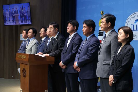 김병기 더불어민주당 원내대표가 15일 오전 서울 여의도 국회 소통관에서 원내대표단 발표 기자회견을 하고 있다. 왼쪽부터 문금주 대변인, 김현정 대변인, 허영 정책수석, 문진석 운영수석, 김 원내대표, 박상혁 소통수석, 이기헌 비서실장, 김남근 민생부대표. 백승아 대변인. |