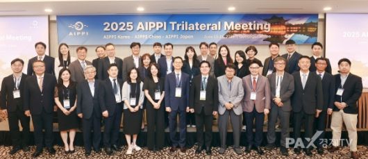 [대전=팍스경제TV] 목성호 특허청 차장은 14일 오전 9시 경주 힐튼호텔에서 국제지식재산보호협회(AIPPI)가 주최한 '2025 한-중-일 3국회의'에 참석했다. 사진은 목성호 특허청 차장(앞줄 왼쪽 아홉 번째)이 '2025 한-중-일 3국회의'에서 관계자들과 기념촬영을 하고 있다. [사진제공=특허청] <저작권자 Copyright ⓒ 팍스경제TV 무단전재 및 재배포 금지>