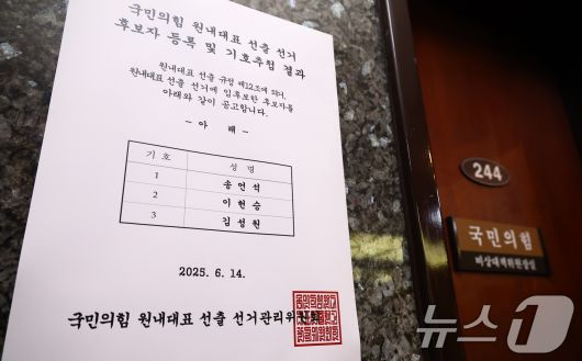 (서울=뉴스1) 김민지 기자 = 국민의힘 원내대표 선거를 하루 앞둔 15일 서울 여의도 국회에 원내대표 선출 공고문이 붙어 있다. 2025.6.15/뉴스1kimkim@news1.krCopyright ⓒ 뉴스1. All rights reserved. 무단 전재 및 재배포, AI학습 이용 금지.