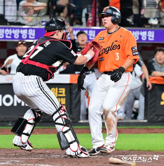 한화는 이어 역전까지 성공했다. 최재훈의 중전안타로 맞은 1사 주자 1·3루 상황, 황영묵의 스퀴즈 번트 뒤 공이 절묘하게 포수 앞쪽에 떨어져 느릿느릿 흘러갔다. 3루에 있던 안치홍이 홈으로 내달렸다. 포수 앞에 떨어진 타구를 장현식이 잡아 포수에게 던졌으나 송구가 엇나가면서 3루주자와 타자주자가 모두 살아 2-1을 만들었다.