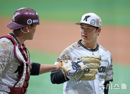 [서울=뉴시스] 김금보 기자 = 8일 서울 구로구 고척스카이돔에서 열린 프로야구 2025 KBO리그 LG 트윈스와 키움 히어로즈의 경기, 1회초 키움 정현우가 투구를 마치고 더그아웃으로 향하며 김건희와 대화하고 있다. 2025.06.08. kgb@newsis.com |