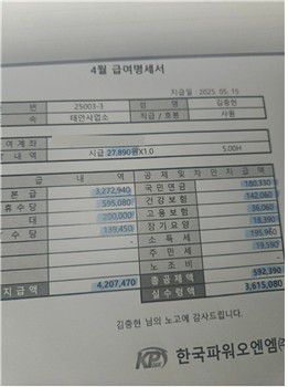 15일 태안화력 고 김충현 비정규직 노동자 사망사고 대책위원회에 따르면 김씨가 사고를 당하기 전인 지난달 15일 한국파워O&M에서 마지막으로 받은 급여는 세전 420만여원(실지급액 361만여원)이었다.
