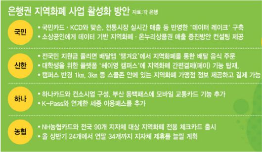 15일 금융권에 따르면 최근 은행은 지역화폐 활성화 정책을 은행 사업에 연결할지 내부 검토에 착수했다. 한 시중은행 고위 관계자는 “추가경정예산 이후 지역화폐가 급속도로 더 많이 풀릴 것으로 예상한다”며 “은행이 소상공인을 위해 구축한 플랫폼, 데이터가 많은 만큼 지역화폐와 어떻게 접목할지 고민하고 있다”고 말했다. 특히 디지털, 소상공인 관련 부서에서는 새 정부에서 대거 통용할 지역화폐를 어떻게 은행권 사업과 연결할지 고심 중이다.