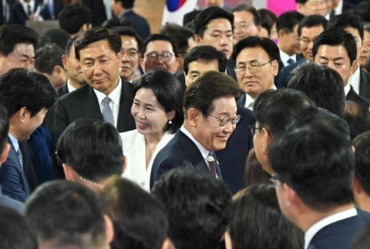 이재명 대통령과 부인 김혜경 여사가 4일 서울 여의도 국회 로텐더홀에서 열린 제21대 대통령 취임선서를 마친 뒤 참석자들과 인사하고 있다.뉴시스 |