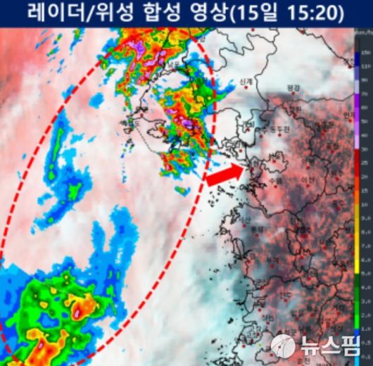 특히 15일 밤(21시∼24시)부터 16일 새벽(0시∼6시) 사이에는 돌풍과 천둥·번개를 동반한 시간당 30mm내외의 강한 비가 내릴 것으로 예상돼 주의가 필요하다.