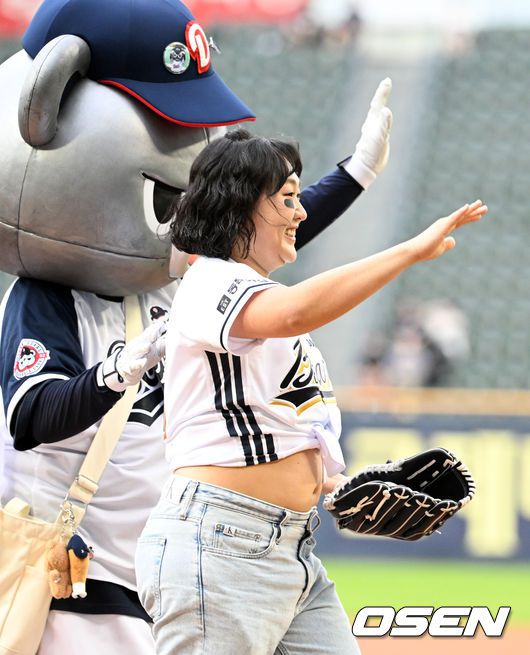 [OSEN=잠실, 조은정 기자]15일 서울 잠실야구장에서 2025 신한 SOL Bank KBO리그 두산 베어스와 키움 히어로즈의 경기가 열렸다. 이날 홈팀 두산은 곽빈을, 원정팀 키움은 정현우를 선발 투수로 내세웠다. 코미디언 이수지가 시구를 마친 뒤 양의지를 향해 손을 흔들고 있다. 2025.06.15 /cej@osen.co.kr