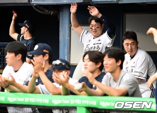 [OSEN=잠실, 조은정 기자]15일 서울 잠실야구장에서 2025 신한 SOL Bank KBO리그 두산 베어스와 키움 히어로즈의 경기가 열렸다. 이날 홈팀 두산은 곽빈을, 원정팀 키움은 정현우를 선발 투수로 내세웠다. 두산 양의지가 시구를 마친 이수지를 향해 손을 흔들고 있다. 2025.06.15 /cej@osen.co.kr