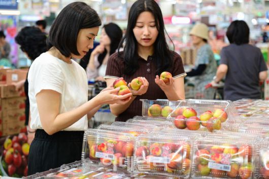 [이데일리 김태형 기자] 15일 서울 서초구 하나로마트 양재점에서 고객들이 천도복숭아를 살펴보고 있다.