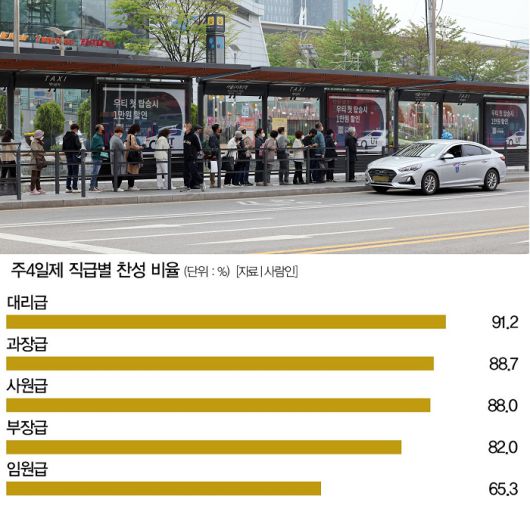 주4일제를 긍정적으로 인식하는 비율은 응답자의 직급에 따라 달랐다. 긍정적으로 생각한 비율이 가장 많은 직급은 '대리급'으로 91.2%에 달했다. '과장(88.7%)' '사원(88.0%)' '부장(82.0%)'이 뒤를 이었다. 임원급은 65.3%로 다른 직급에 비해 훨씬 낮았다.