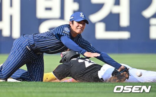 [사진] 이재현 글러브 꺾인 사이 안현민 2루 도루 성공