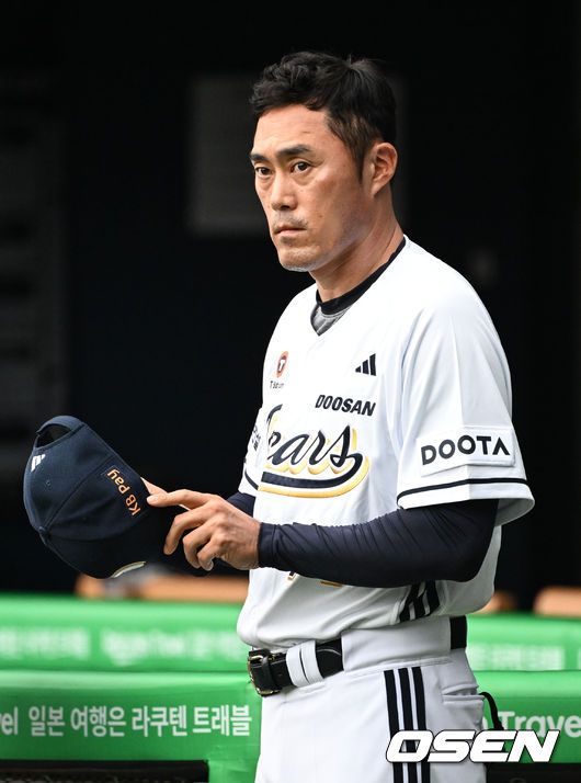 [OSEN=잠실, 조은정 기자]15일 서울 잠실야구장에서 2025 신한 SOL Bank KBO리그 두산 베어스와 키움 히어로즈의 경기가 열렸다. 이날 홈팀 두산은 곽빈을, 원정팀 키움은 정현우를 선발 투수로 내세웠다. 두산 조성환 감독대행이 키움 벤치를 바라보고 있다. 2025.06.15 /cej@osen.co.kr