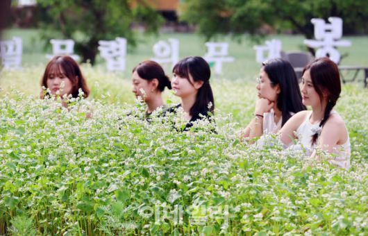[이데일리 김태형 기자] 15일 휴일을 맞아 강원도 평창 봉평에서 열린 제3회 봉평 오얏나무숲 메밀꽃축제를 찾은 방문객들이 초여름 메밀꽃밭에서 멍때리기 체험을 즐기고 있다.