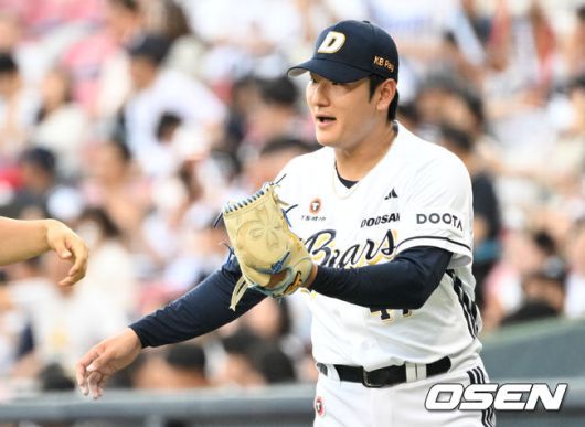 [OSEN=잠실, 조은정 기자]15일 서울 잠실야구장에서 2025 신한 SOL Bank KBO리그 두산 베어스와 키움 히어로즈의 경기가 열렸다. 이날 홈팀 두산은 곽빈을, 원정팀 키움은 정현우를 선발 투수로 내세웠다. 1회초 이닝을 마친 두산 선발 곽빈이 야수진을 맞이하고 있다. 2025.06.15 /cej@osen.co.kr