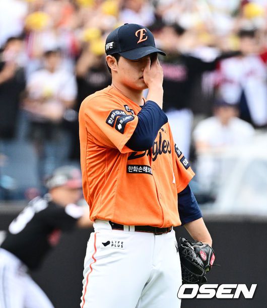 [OSEN=대전, 지형준 기자] 15일 대전 한화생명볼파크에서 2025 신한 SOL Bank KBO리그 한화 이글스와 LG 트윈스의 경기가 열렸다. 이날 한화는 문동주, LG는 송승기를 선발로 내세웠다. 3회초 1사 만루에서 한화 문동주가 LG 김현수에 선제 1타점 적시타를 허용하며 아쉬워하고 있다. 2025.06.15 /jpnews@osen.co.kr