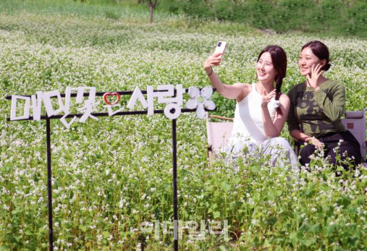 [이데일리 김태형 기자] 15일 휴일을 맞아 강원도 평창 봉평에서 열린 제3회 봉평 오얏나무숲 메밀꽃축제를 찾은 방문객들이 초여름 메밀꽃밭을 배경으로 기념사진을 촬영하고 있다.
