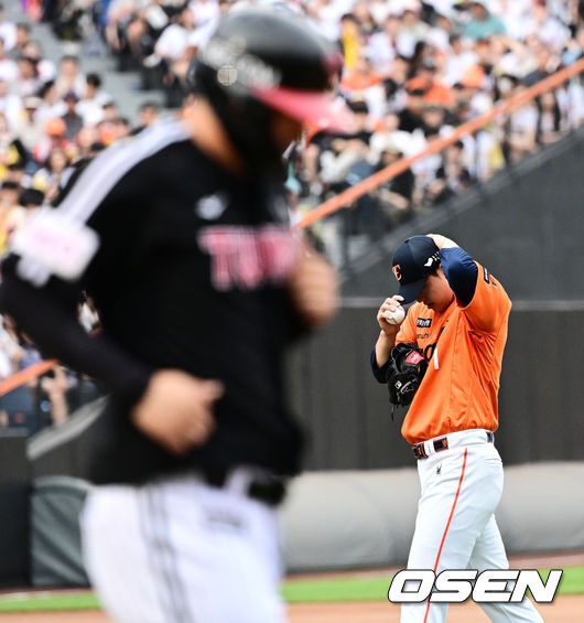 [OSEN=대전, 지형준 기자] 15일 대전 한화생명볼파크에서 2025 신한 SOL Bank KBO리그 한화 이글스와 LG 트윈스의 경기가 열렸다. 이날 한화는 문동주, LG는 송승기를 선발로 내세웠다. 3회초 2사 만루에서 한화 문동주가 LG 문보경에 밀어내기 볼넷을 허용하며 아쉬워하고 있다. 2025.06.15 /jpnews@osen.co.kr