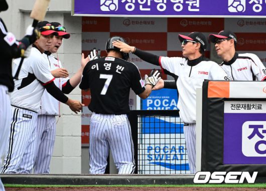 [OSEN=대전, 지형준 기자] 15일 대전 한화생명볼파크에서 2025 신한 SOL Bank KBO리그 한화 이글스와 LG 트윈스의 경기가 열렸다. 이날 한화는 문동주, LG는 송승기를 선발로 내세웠다. 3회초 2사 만루에서 LG 이영빈이 문보경의 밀어내기 볼넷에 홈을 밟고 염경엽 감독과 하이파이브를 하고 있다. 2025.06.15 /jpnews@osen.co.kr