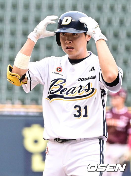 [OSEN=잠실, 조은정 기자]15일 서울 잠실야구장에서 2025 신한 SOL Bank KBO리그 두산 베어스와 키움 히어로즈의 경기가 열렸다. 이날 홈팀 두산은 곽빈을, 원정팀 키움은 정현우를 선발 투수로 내세웠다. 3회말 1사 두산 정수빈이 중전 안타를 날린 뒤 세리머니를 하고 있다. 2025.06.15 /cej@osen.co.kr