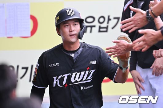[OSEN=대구, 이석우 기자] 15일 대구삼성라이온즈파크에서 2025 신한 SOL 뱅크 KBO 리그 삼성 라이온즈와 KT 위즈의 경기가 열렸다. 홈팀 삼성은 최원태가, 방문팀 KT는 고영표가 선발 출전했다. KT 위즈 배정대가 2회초 2사 2루 김상수의 중견수 앞 안타대 득점을 올리고 하이파이브를 하고 있다. 2025.06.15 / foto0307@osen.co.kr