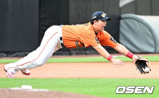 3회초 1사 만루에서 한화 노시환이 LG 김현수의 선제 1타점 적시타에 몸날려 잡아내고 있다. 2025.06.15 /jpnews@osen.co.kr