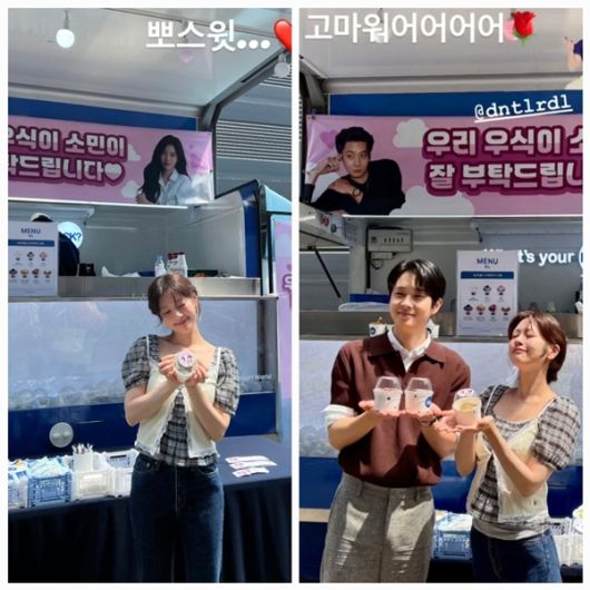 이어진 사진에서는 정소민과 최우식이 나란히 서서 각각 아이스크림을 들고 웃고 있다. 박보영이 보낸 간식차에는 “우리 우식이 소민이 잘 부탁드립니다♥”라는 문구가 크게 적혀 있어, 세 배우의 끈끈한 우정과 애정을 엿보게 했다.