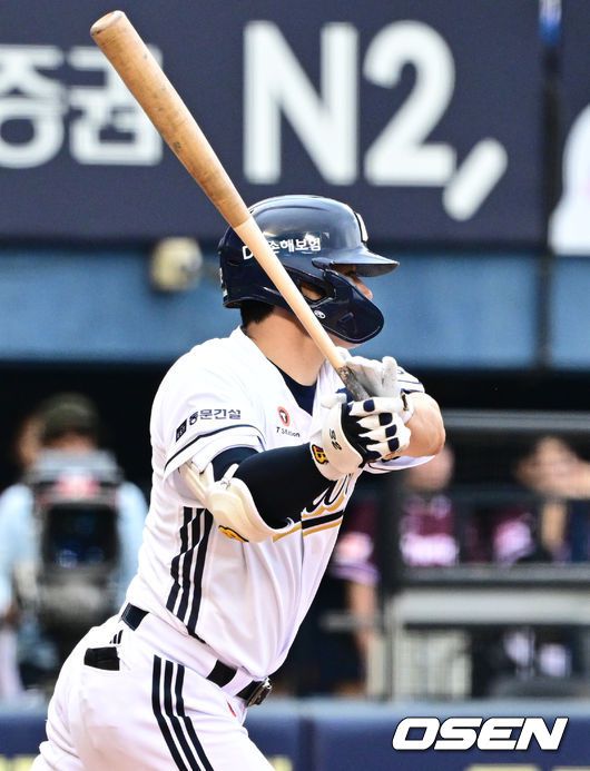 [OSEN=잠실, 조은정 기자]15일 서울 잠실야구장에서 2025 신한 SOL Bank KBO리그 두산 베어스와 키움 히어로즈의 경기가 열렸다. 이날 홈팀 두산은 곽빈을, 원정팀 키움은 정현우를 선발 투수로 내세웠다. 4회말 1사 3루 두산 김재환이 선취 적시타를 날리고 있다. 2025.06.15 /cej@osen.co.kr