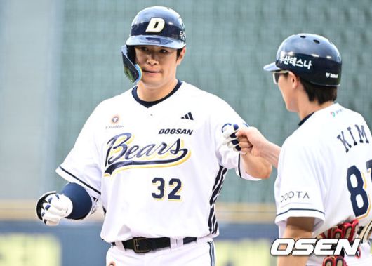 [OSEN=잠실, 조은정 기자]15일 서울 잠실야구장에서 2025 신한 SOL Bank KBO리그 두산 베어스와 키움 히어로즈의 경기가 열렸다. 이날 홈팀 두산은 곽빈을, 원정팀 키움은 정현우를 선발 투수로 내세웠다. 4회말 1사 3루 두산 김재환이 선취 적시타를 날린 뒤 기뻐하고 있다. 2025.06.15 /cej@osen.co.kr