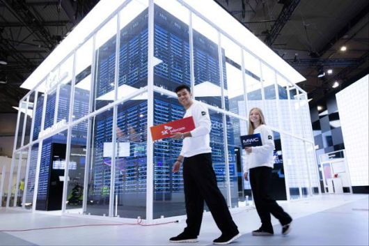 SK텔레콤 모델이 지난 3월 스페인 바르셀로나 모바일월드콩그레스(MWC) 2025 전시장에서 인공지능 데이터센터(AIDC)를 상징하는 구조물 앞에 서서 포즈를 취하고 있다. SK텔레콤 제공 |