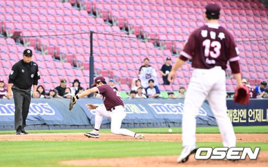 [OSEN=잠실, 조은정 기자]15일 서울 잠실야구장에서 2025 신한 SOL Bank KBO리그 두산 베어스와 키움 히어로즈의 경기가 열렸다. 이날 홈팀 두산은 곽빈을, 원정팀 키움은 정현우를 선발 투수로 내세웠다. 4회말 2사 3사 3루 키움 3루수 송성문이 두산 김기연의 땅볼에 포구 실책을 범하고 있다. 이때 3루주자 김재환이 득점을 올렸다. 2025.06.15 /cej@osen.co.kr