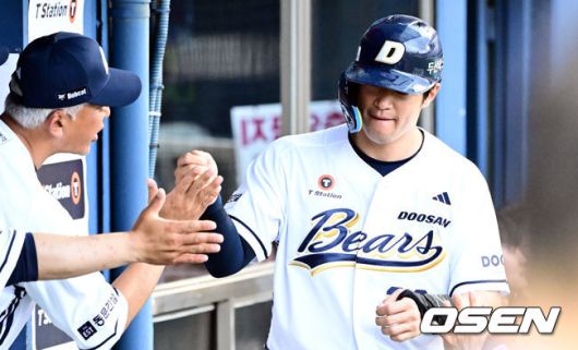 4회말 2사 3사 3루 키움 3루수 송성문이 두산 김기연의 땅볼에 포구 실책을 범했다. 실책을 틈타 3루주자 김재환이 득점을 올린 뒤 더그아웃에서 환영을 받고 있다. 2025.06.15 /cej@osen.co.kr