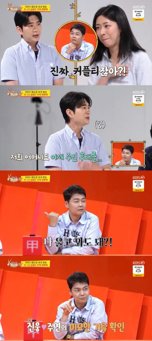 김진웅 역시 “저희 어머니도 이제 주연이를 (좋아해요)”라고 맞장구치자 전현무는 “뭐야? 나 울고 와도 돼?”라며 당황했다. 전현무는 “진웅이 어머님이 아나운서실에 오셨잖아. 나는 그때 둘의 미묘한 기류를 봤어. 그래서 일부러 둘한테 연락을 안 하고 있어. 둘이 불편할까 봐”라며 이미 눈치채고 있었다고 밝혔다.