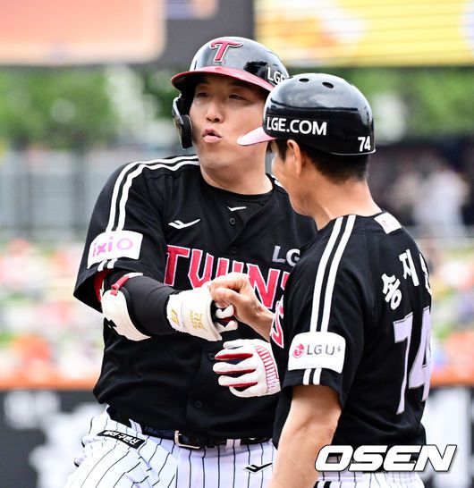 [OSEN=대전, 지형준 기자] 15일 대전 한화생명볼파크에서 2025 신한 SOL Bank KBO리그 한화 이글스와 LG 트윈스의 경기가 열렸다. 이날 한화는 문동주, LG는 송승기를 선발로 내세웠다. 4회초 2사 만루에서 LG 김현수가 2타점 좌전 적시타 날리며 기뻐하고 있다. 2025.06.15 /jpnews@osen.co.kr