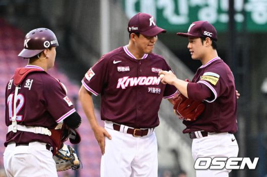 [OSEN=잠실, 조은정 기자]15일 서울 잠실야구장에서 2025 신한 SOL Bank KBO리그 두산 베어스와 키움 히어로즈의 경기가 열렸다. 이날 홈팀 두산은 곽빈을, 원정팀 키움은 정현우를 선발 투수로 내세웠다. 4회말 키움 정현우가 2실점을 하자 코칭스태프가 마운드에 올라 대화를 나누고 있다. 2025.06.15 /cej@osen.co.kr