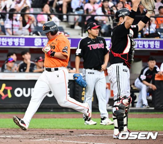 [OSEN=대전, 지형준 기자] 15일 대전 한화생명볼파크에서 2025 신한 SOL Bank KBO리그 한화 이글스와 LG 트윈스의 경기가 열렸다. 이날 한화는 문동주, LG는 송승기를 선발로 내세웠다. 4회말 1사 만루에서 한화 안치홍이 이진영의 1타점 희생플라이에 득점에 성공하고 있다. 2025.06.15 /jpnews@osen.co.kr