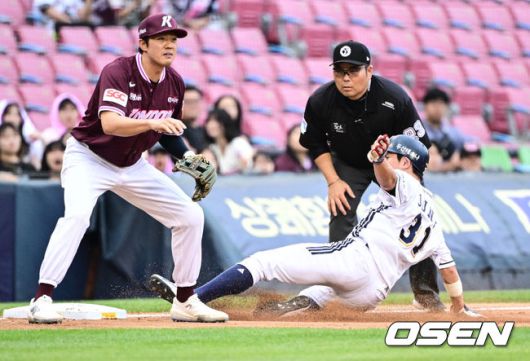 [OSEN=잠실, 조은정 기자]15일 서울 잠실야구장에서 2025 신한 SOL Bank KBO리그 두산 베어스와 키움 히어로즈의 경기가 열렸다. 이날 홈팀 두산은 곽빈을, 원정팀 키움은 정현우를 선발 투수로 내세웠다. 5회말 무사 1루 키움 정현우의 견제 송구실책을 틈타 두산 정수빈이 3루 베이스를 밟고 있다. 2025.06.15 /cej@osen.co.kr