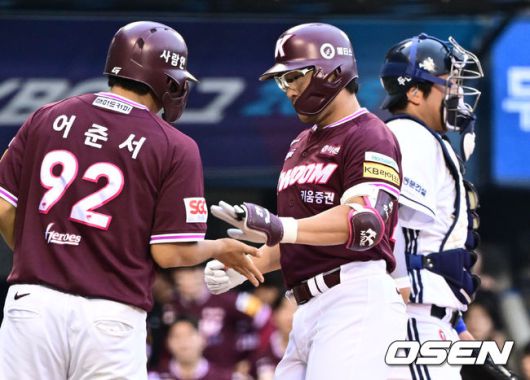 [OSEN=잠실, 조은정 기자]15일 서울 잠실야구장에서 2025 신한 SOL Bank KBO리그 두산 베어스와 키움 히어로즈의 경기가 열렸다. 이날 홈팀 두산은 곽빈을, 원정팀 키움은 정현우를 선발 투수로 내세웠다. 6회초 1사 1루 키움 임지열이 좌월 투런포를 날린 뒤 어준서와 기뻐하고 있다. 2025.06.15 /cej@osen.co.kr
