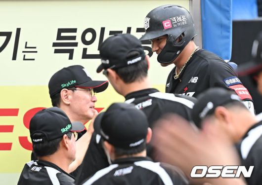 [OSEN=대구, 이석우 기자] 15일 대구삼성라이온즈파크에서 2025 신한 SOL 뱅크 KBO 리그 삼성 라이온즈와 KT 위즈의 경기가 열렸다. 홈팀 삼성은 최원태가, 방문팀 KT는 고영표가 선발 출전했다. KT 위즈 안현민이 5회초 무사 1루 좌월 2점 홈런을 치고 이강철 감독과 하이파이브를 하고 있다. 2025.06.15 / foto0307@osen.co.kr