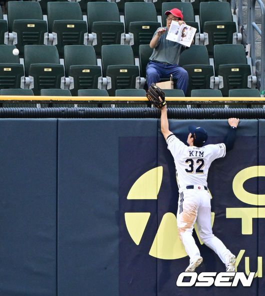 [OSEN=잠실, 조은정 기자]15일 서울 잠실야구장에서 2025 신한 SOL Bank KBO리그 두산 베어스와 키움 히어로즈의 경기가 열렸다. 이날 홈팀 두산은 곽빈을, 원정팀 키움은 정현우를 선발 투수로 내세웠다. 6회초 1사 1루 두산 좌익수 김재환이 키움 임지열의 투런포에 공을 잡지 못하고 있다. 2025.06.15 /cej@osen.co.kr