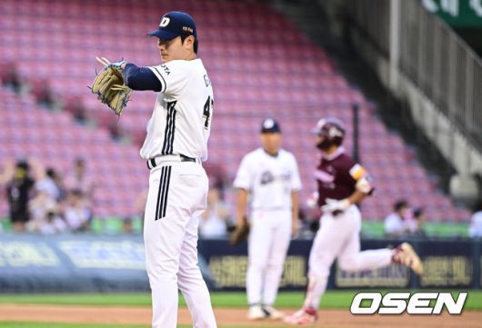 [OSEN=잠실, 조은정 기자]15일 서울 잠실야구장에서 2025 신한 SOL Bank KBO리그 두산 베어스와 키움 히어로즈의 경기가 열렸다. 이날 홈팀 두산은 곽빈을, 원정팀 키움은 정현우를 선발 투수로 내세웠다. 6회초 1사 1루 두산 선발 곽빈이 키움 임지열에게 투런포를 허용한 뒤 아쉬워하고 있다. 2025.06.15 /cej@osen.co.kr