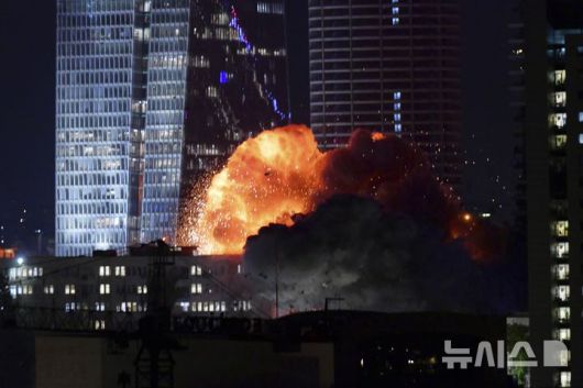 [텔아비브=AP/뉴시스] 13일(현지 시간) 이스라엘 텔아비브에서 미사일 공격으로 폭발이 일어나고 있다. 이란은 13일 밤과 14일 새벽 탄도미사일 등을 동원해 이스라엘 예루살렘과 텔아비브를 공격했다. 2025.06.14. |