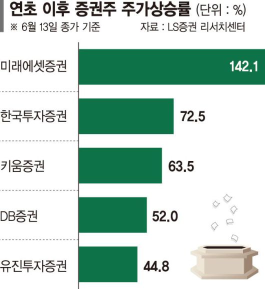 증권업종의 주가 상승률도 단연 돋보인다. LS증권에 따르면 최근 한 달간 증권업종은 30.2% 상승하며 코스피 상승률(11.9%)을 크게 웃돌았다. 연초 이후 기준으로는 무려 70% 가까운 상승세를 나타냈다. 최근 새 정부 출범에 따른 상법 개정, 배당소득 분리과세 등 정책 호재도 선반영된 결과로 풀이된다.