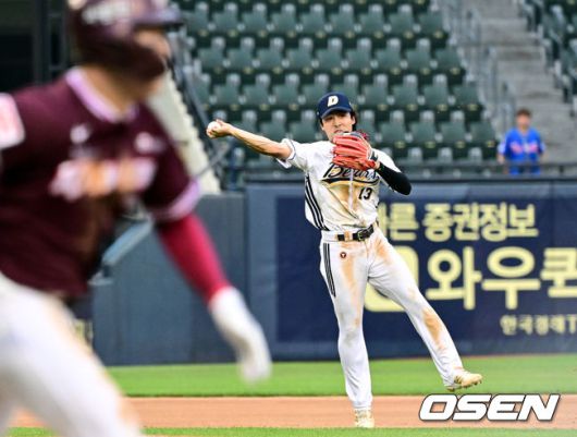 7회초 무사 1루 두산 유격수 이유찬이 키움 전태현의 타구를 1루로 송구, 아웃시키고 있다. 2025.06.15 /cej@osen.co.kr